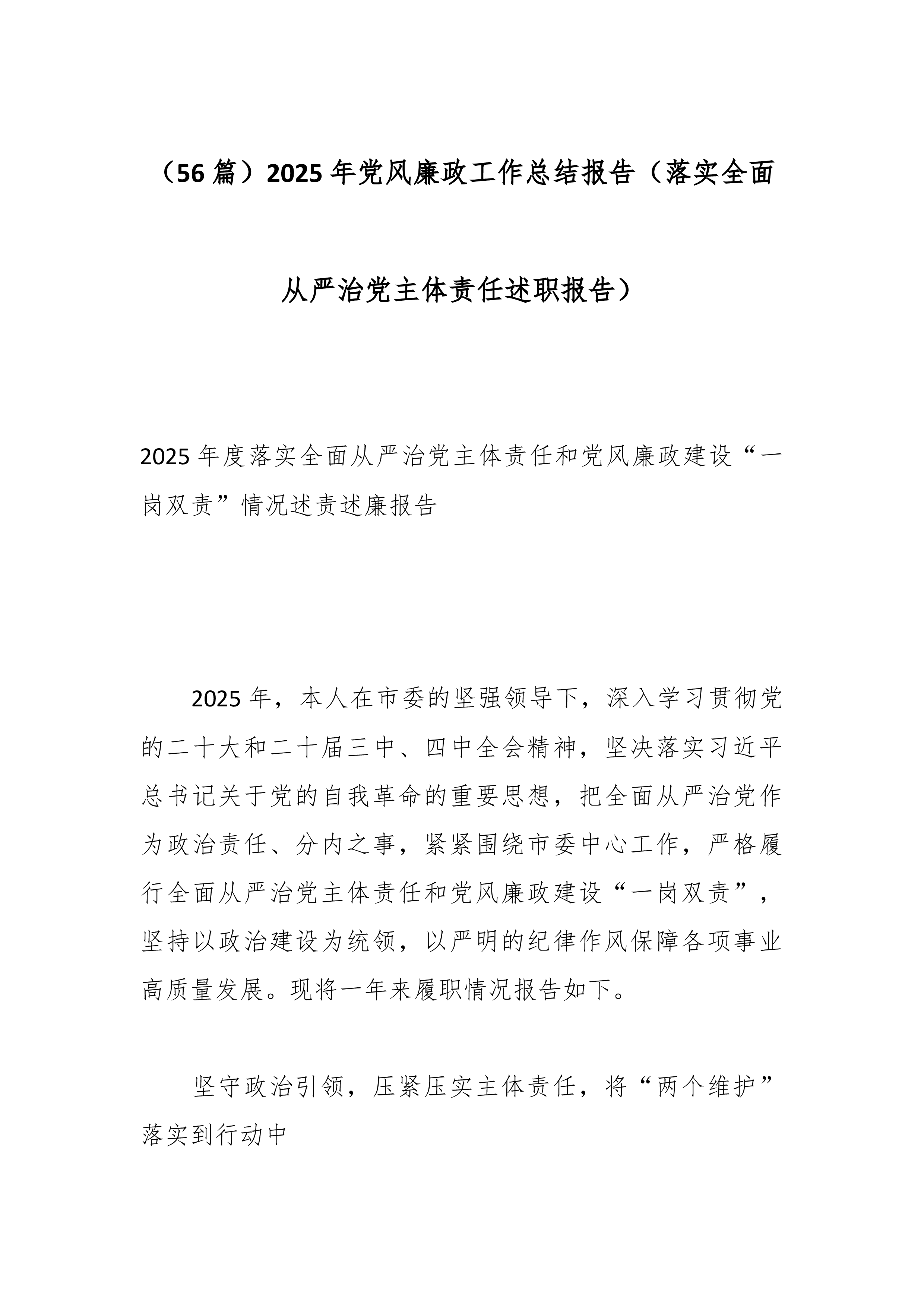 (56篇)2025年党风廉政工作总结报告(落实全面从严治党主体责任述职报告)2025年度落实全面从严治党主体责任和党风廉政建设“一岗双责”情况述责述廉报告 2025年,本人在市委的坚强领导下,深入学习贯彻党的二十大和二十届三中、四中全会精神,坚决落实习近平总书记关于党的自我革命的重要思想,把全面从严治党作为政治责任、分内之事,紧紧围绕市委中心工作,严格履行全面从严治党主体责任和党风廉政建设“一岗双责”,坚持以政治建设为统领,以严明的纪律作风保障各项事业高质量发展。现将一年来履职情况报告如下。 坚守政治引领,压紧压实主体责任,将“两个维护”落实到行动中 党的领导是全面从严治党的根本保证。本人始终把政治建设摆在首位,以高度的政治自觉、思想自觉、行动自觉,推动主体责任层层落实,确保党中央决策...
