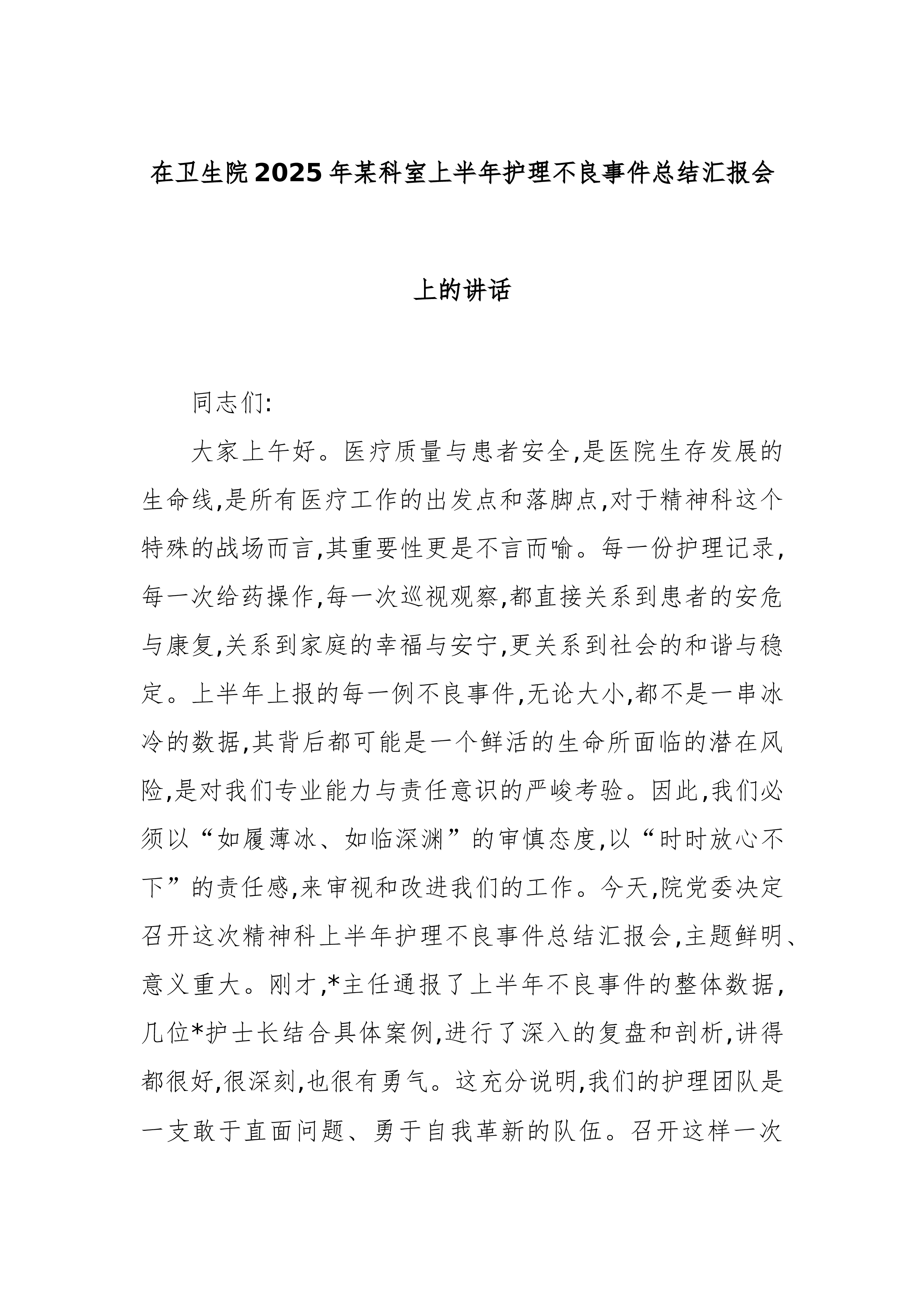 在卫生院2025年某科室上半年护理不良事件总结汇报会上的讲话同志们:大家上午好。医疗质量与患者安全,是医院生存发展的生命线,是所有医疗工作的出发点和落脚点,对于精神科这个特殊的战场而言,其重要性更是不言而喻。每一份护理记录,每一次给药操作,每一次巡视观察,都直接关系到患者的安危与康复,关系到家庭的幸福与安宁,更关系到社会的和谐与稳定。上半年上报的每一例不良事件,无论大小,都不是一串冰冷的数据,其背后都可能是一个鲜活的生命所面临的潜在风险,是对我们专业能力与责任意识的严峻考验。因此,我们必须以“如履薄冰、如临深渊”的审慎态度,以“时时放心不下”的责任感,来审视和改进我们的工作。今天,院党委决定召开这次精神科上半年护理不良事件总结汇报会,主题鲜明、意义重大。刚才,*主任通报了上半年不良事件的整体...