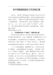 关于民族团结进步工作总结汇报近年来,我市深入贯彻落实中央民族工作会议和习近平总书记考察我省时的重要讲话精神,坚持以民族团结促进乡村振兴为抓手,把铸牢中华民族共同体意识贯穿于乡村振兴战略的始终,通过组织引领,创新“民族团结+”模式,在产业、人才、文化、生态、组织“五个振兴”上齐发力,不断推进民族团结进步创建工作高质量发展,奏响了新时代民族团结进步的动人乐章。一、“民族团结进步+产业振兴”凝聚发展力量我市自始至终坚持在产业发展过程中紧紧抓住铸牢中华民族共同体意识这一主线,积极探索“民族团结进步+产业”的发展新模式,将发展特色农业与民族团结、乡村振兴等工作结合起来,坚持“输血”与“造血”双向发力,推...