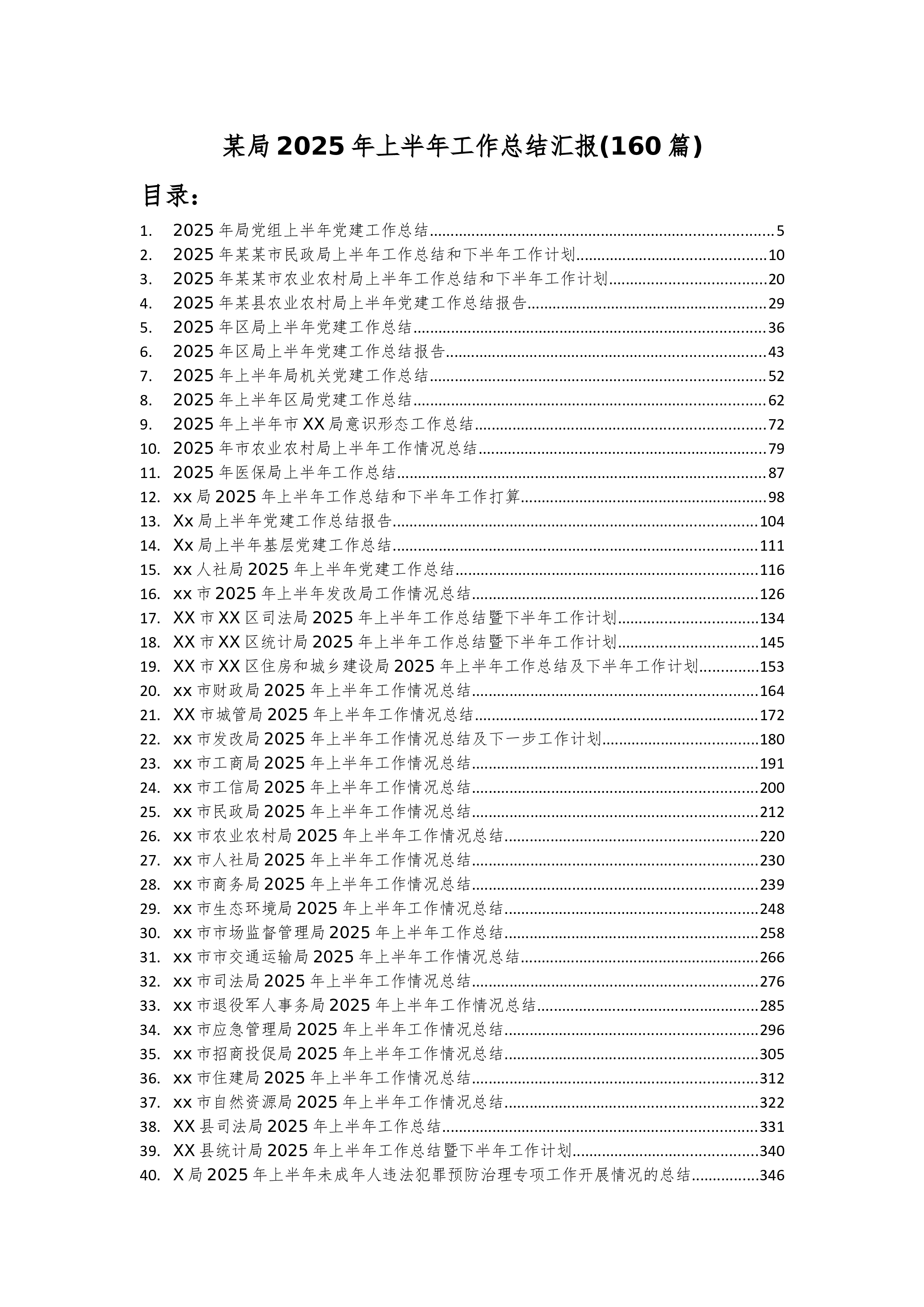 某局2025年上半年工作总结汇报(160篇)目录:1.2025年局党组上半年党建工作总结..................................................................................52.2025年某某市民政局上半年工作总结和下半年工作计划.............................................103.2025年某某市农业农村局上半年工作总结和下半年工作计划.....................................204.2025年某县农业农村局上半年党建工作总结报告.........................................................