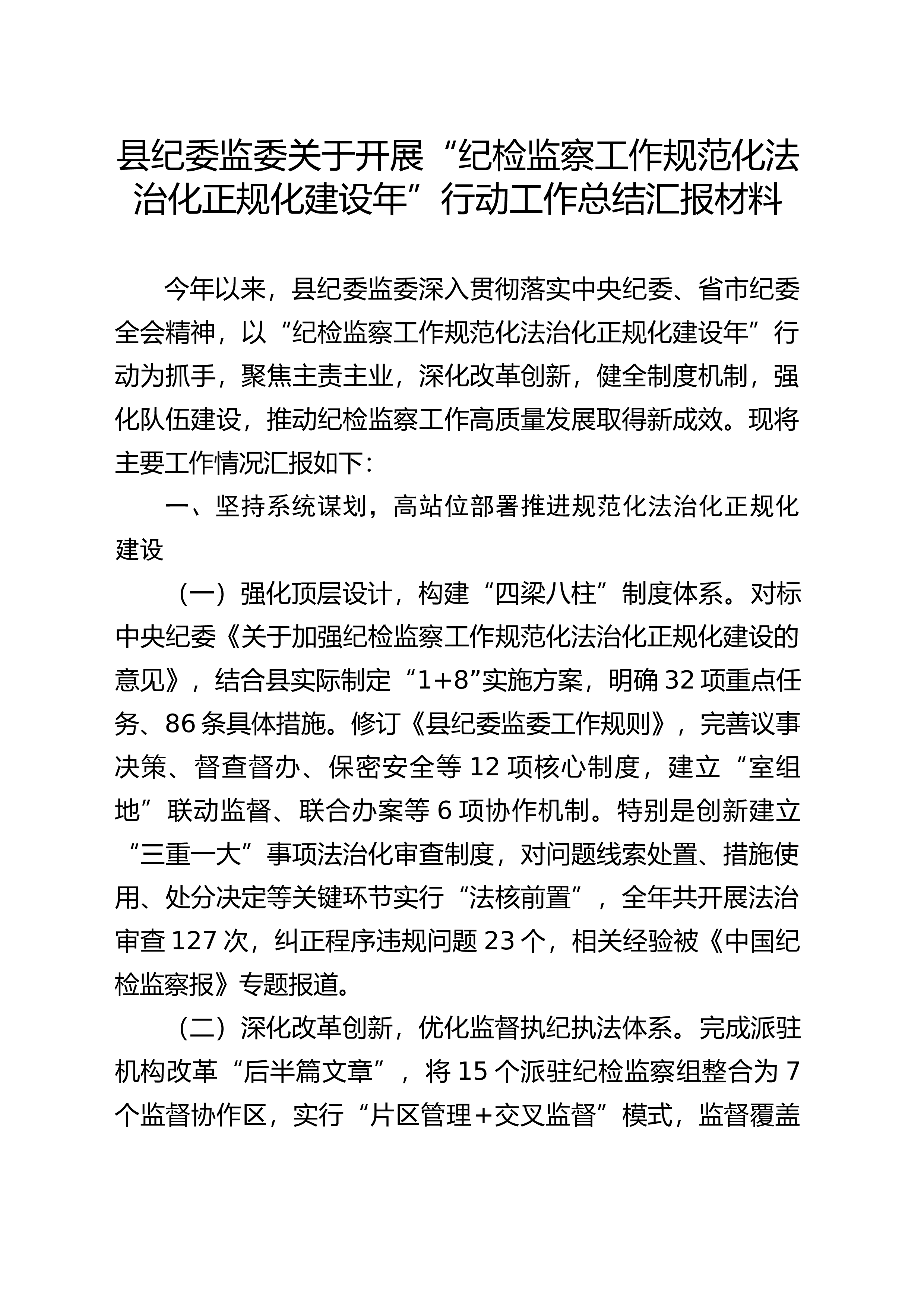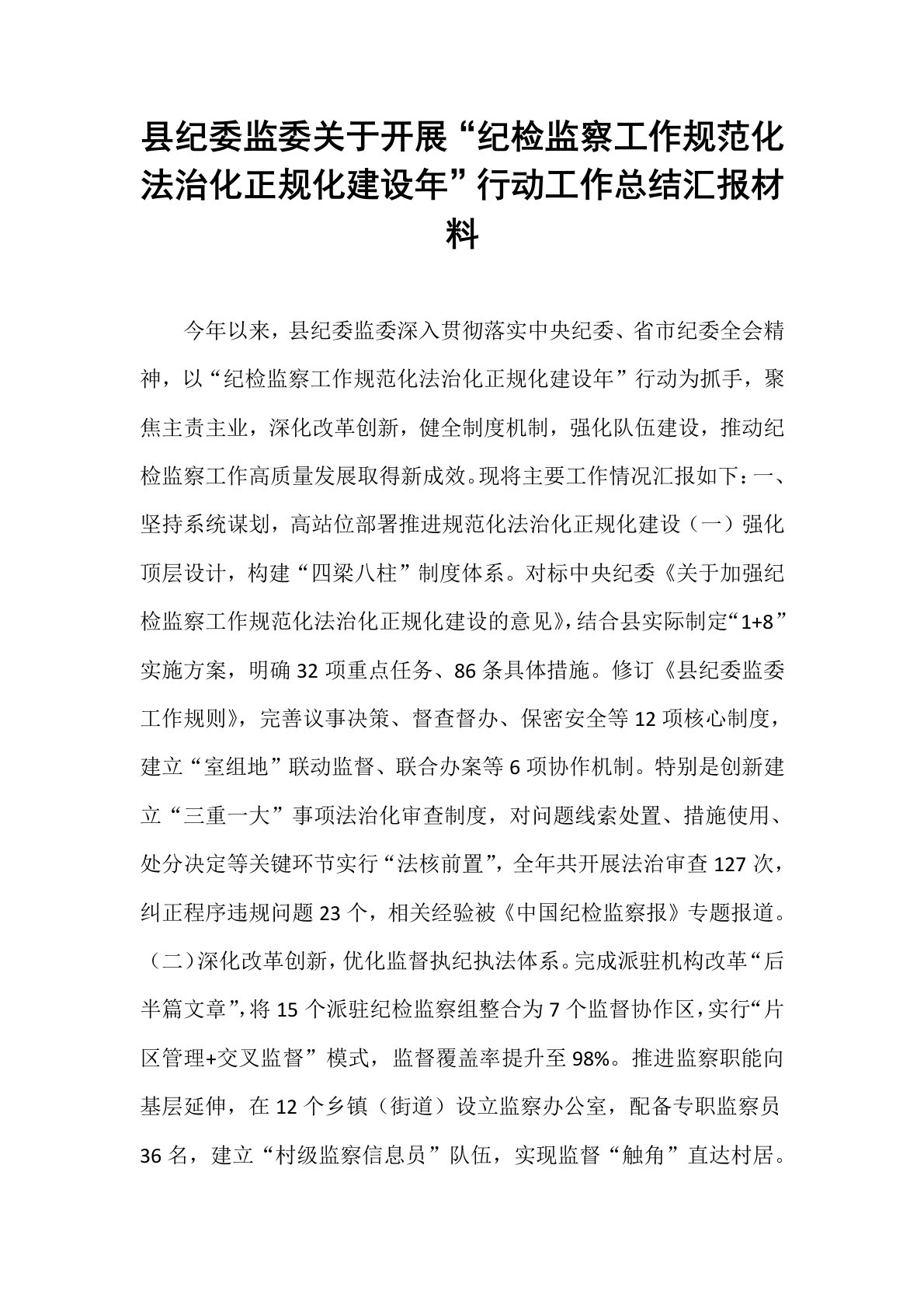 县纪委监委关于开展“纪检监察工作规范化法治化正规化建设年”行动工作总结汇报材料今年以来,县纪委监委深入贯彻落实中央纪委、省市纪委全会精神,以“纪检监察工作规范化法治化正规化建设年”行动为抓手,聚焦主责主业,深化改革创新,健全制度机制,强化队伍建设,推动纪检监察工作高质量发展取得新成效。现将主要工作情况汇报如下:一、坚持系统谋划,高站位部署推进规范化法治化正规化建设(一)强化顶层设计,构建“四梁八柱”制度体系。对标中央纪委《关于加强纪检监察工作规范化法治化正规化建设的意见》,结合县实际制定“1+8”实施方案,明确32项重点任务、86条具体措施。修订《县纪委监委工作规则》,完善议事决策、督查督办、保密安全等12项核心制度,建立“室组地”联动监督、联合办案等6项协作机制。特别是创新建立“三重一大”...