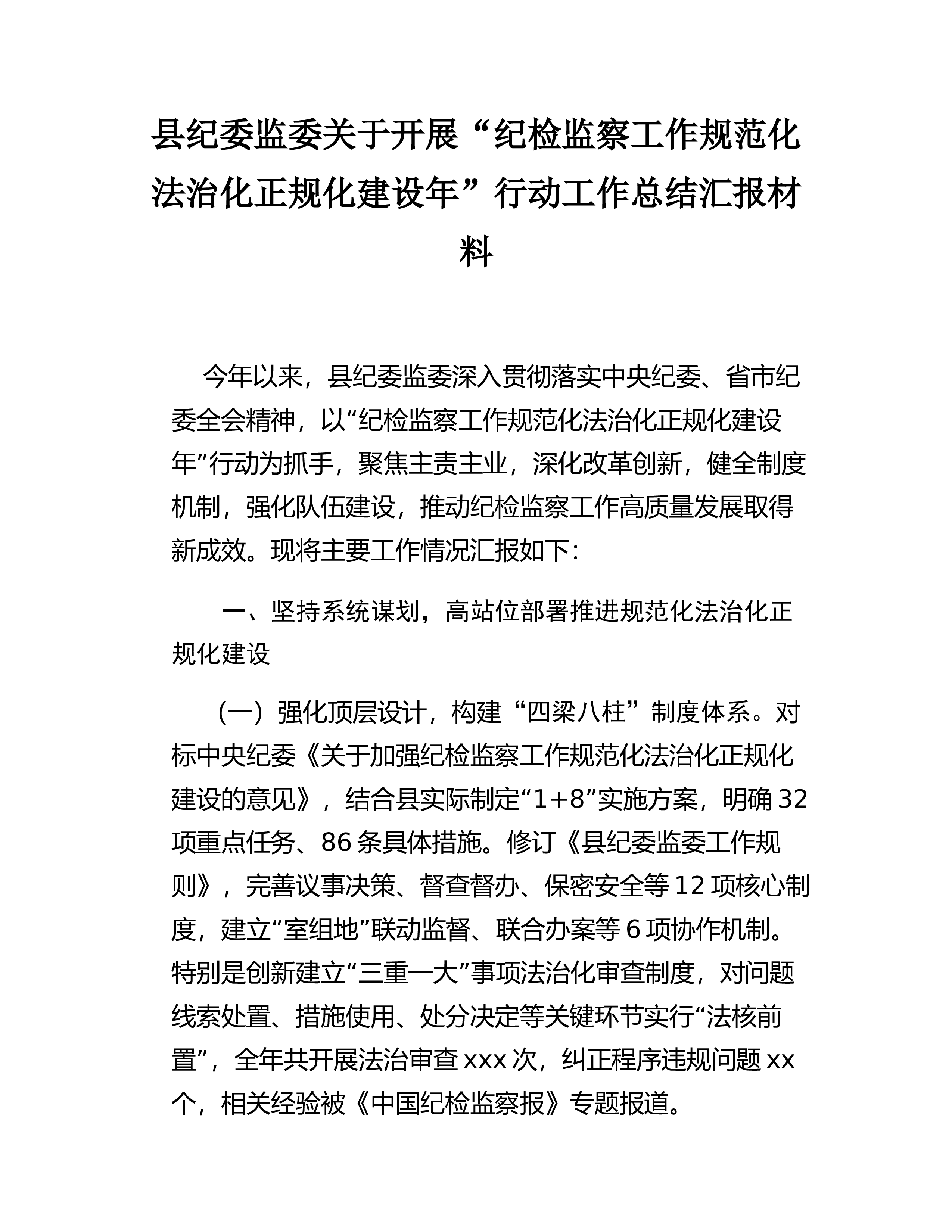 县纪委监委关于开展“纪检监察工作规范化法治化正规化建设年”行动工作总结汇报材料今年以来,县纪委监委深入贯彻落实中央纪委、省市纪“委全会精神,以纪检监察工作规范化法治化正规化建设”年行动为抓手,聚焦主责主业,深化改革创新,健全制度机制,强化队伍建设,推动纪检监察工作高质量发展取得新成效。现将主要工作情况汇报如下:一、坚持系统谋划,高站位部署推进规范化法治化正规化建设(一)强化顶层设计,构建“四梁八柱”制度体系。对标中央纪委《关于加强纪检监察工作规范化法治化正规化“建设的意见》,结合县实际制定1+8”实施方案,明确32项重点任务、86条具体措施。修订《县纪委监委工作规则》,完善议事决策、督查督办、...