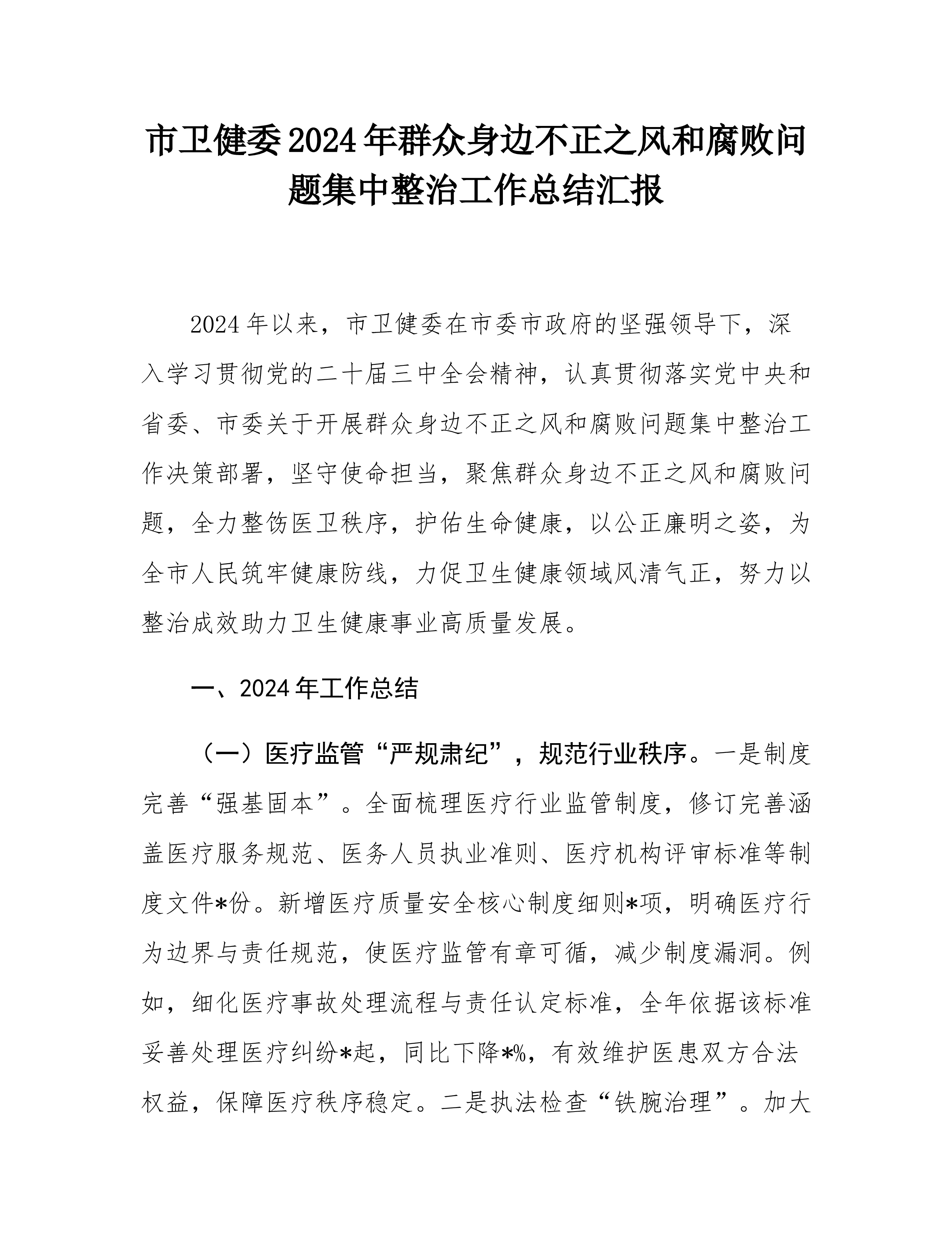 市卫健委2024年群众身边不正之风和腐败问题集中整治工作总结汇报2024年以来,市卫健委在市委市政府的坚强领导下,深入学习贯彻党的二十届三中全会精神,认真贯彻落实党中央和省委、市委关于开展群众身边不正之风和腐败问题集中整治工作决策部署,坚守使命担当,聚焦群众身边不正之风和腐败问题,全力整饬医卫秩序,护佑生命健康,以公正廉明之姿,为全市人民筑牢健康防线,力促卫生健康领域风清气正,努力以整治成效助力卫生健康事业高质量发展。一、2024年工作总结(一)医疗监管“严规肃纪”,规范行业秩序。一是制度完善“强基固本”。全面梳理医疗行业监管制度,修订完善涵盖医疗服务规范、医务人员执业准则、医疗机构评审标准等...
