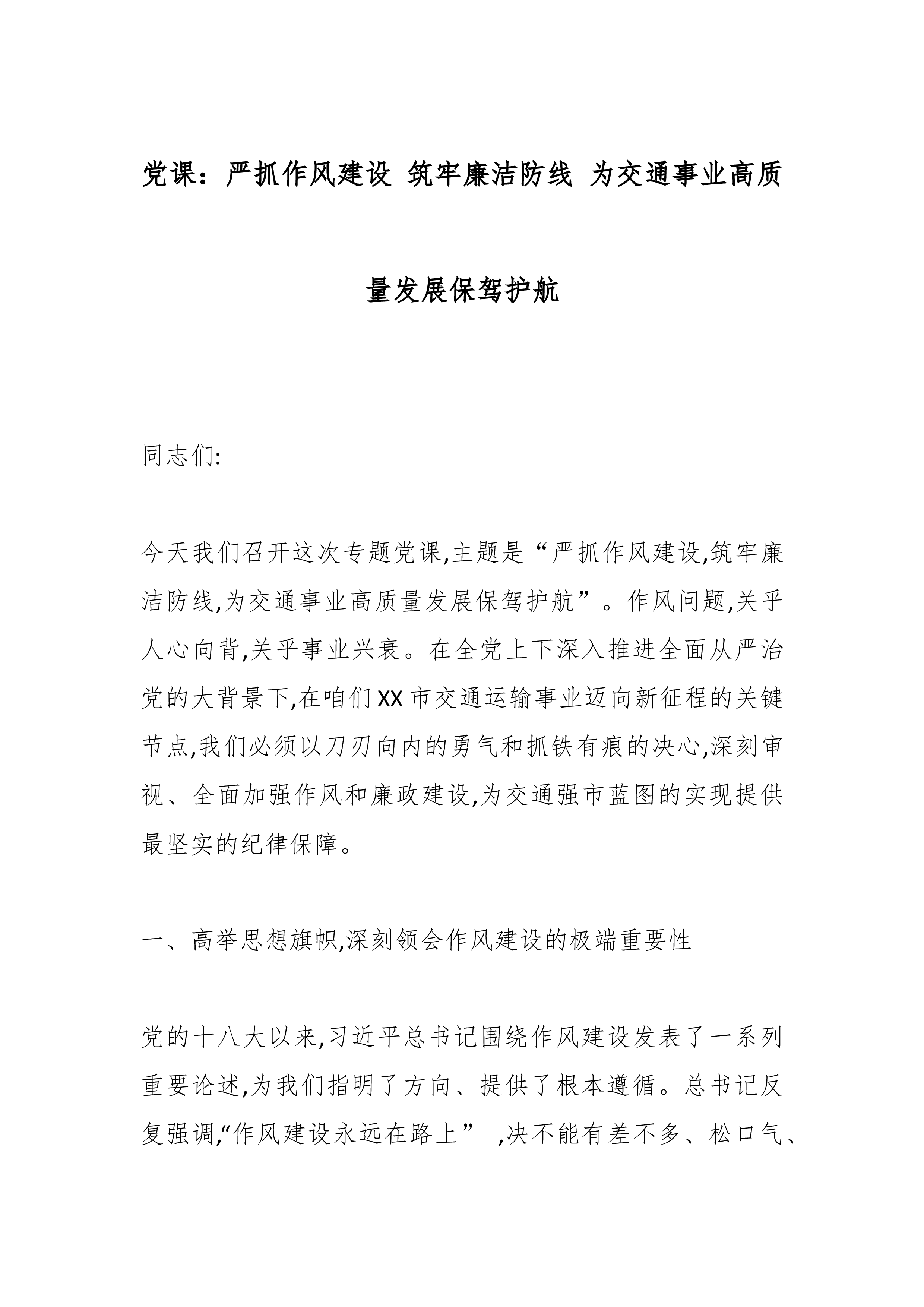 党课:严抓作风建设筑牢廉洁防线为交通事业高质量发展保驾护航同志们:今天我们召开这次专题党课,主题是“严抓作风建设,筑牢廉洁防线,为交通事业高质量发展保驾护航”。作风问题,关乎人心向背,关乎事业兴衰。在全党上下深入推进全面从严治党的大背景下,在咱们XX市交通运输事业迈向新征程的关键节点,我们必须以刀刃向内的勇气和抓铁有痕的决心,深刻审视、全面加强作风和廉政建设,为交通强市蓝图的实现提供最坚实的纪律保障。一、高举思想旗帜,深刻领会作风建设的极端重要性党的十八大以来,习近平总书记围绕作风建设发表了一系列重要论述,为我们指明了方向、提供了根本遵循。总书记反复强调,“作风建设永远在路上”,决不能有差不多、松口气、歇歇脚的想法。他告诫全党,“我们党作为马克思主义执政党,不但要有强大的真理力量,而且要有强...