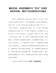 廉政党课:深刻把握新时代“四风”治理的成效和经验,锲而不舍加强党的作风建设“四风”问题是党和人民的大敌。党的十八大以来,以同志为核心的党中央采取了一系列创新举措,包括在治理目的上坚持“纠”与“树”同时并举,在治理主体上坚持“党”与“群”有机统一,在治理对象上坚持“点”与“面”同抓共管,在治理内容上坚持“风”与“腐”同查同治,在治理方式上坚持“柔”与“刚”同向发力,坚决地同“四风”作斗争,取得了历史性成就。同时,在“四风”治理的实践中也积累了宝贵经验:必须坚持以政治建设为统领、以思想教育为基础、以人民为中心的导向、以“关键少数”为抓手、以制度建设为保障。这对于在新征程上,更好地以作风建设新成效推动全面从严治党,持续筑牢人民对党的信任根基,进一步凝聚起全面深化改革、推进中国式现代化的磅礴力量,具...