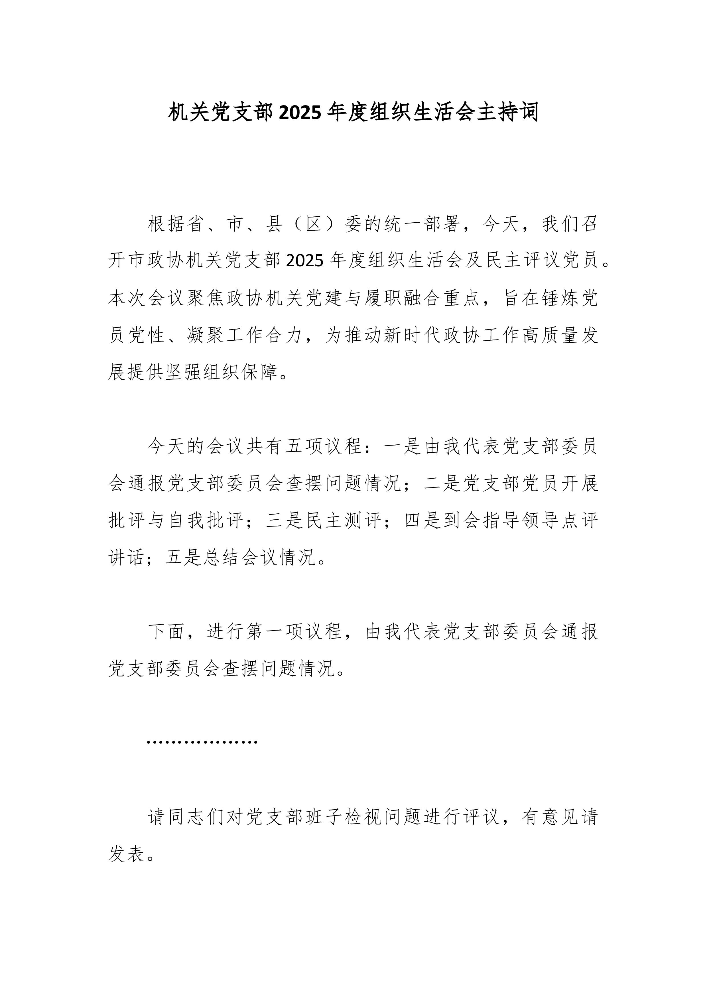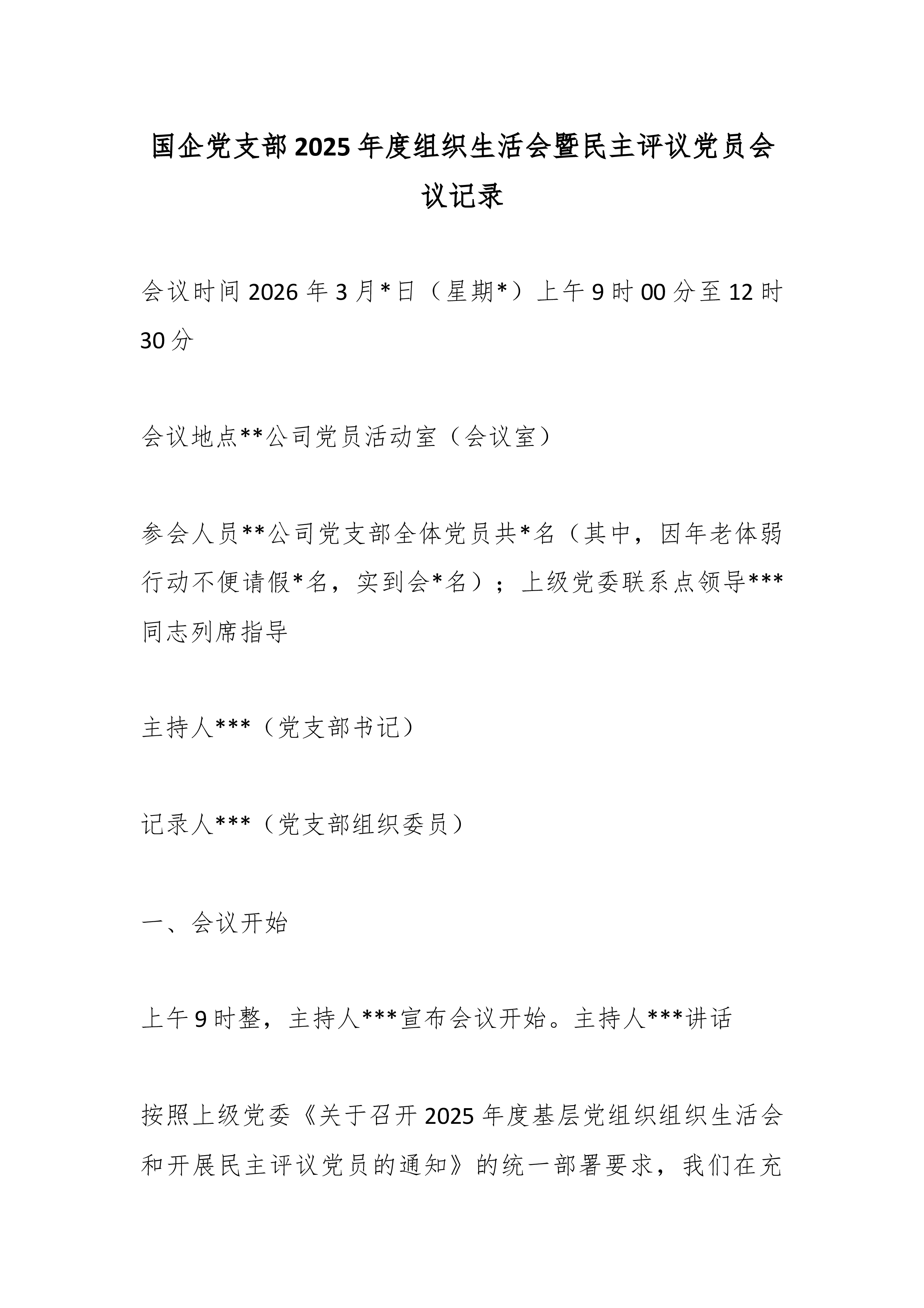 党支部2025年度组织生活会和开展民主评议党员工作实施方案(公司)党的建设是党的事业的根本保证。根据党章和党内有关规定,按照上级党委关于召开2025年度组织生活会和开展民主评议党员工作的有关部署要求,结合我支部工作实际,现就做好相关工作制定如下实施方案。一、会议主题深入学习贯彻习近平新时代中国特色社会主义思想,全面贯彻落实党的二十届四中全会精神,以打攻坚战、持久战的决心和恒心,锲而不舍落实中央八项规定精神,推进作风建设常态化长效化,以优良作风凝心聚力、真抓实干,奋力开创中国式现代化建设新局面。二、会前准备(一)扎实开展理论学习。组织生活会召开前,采取集中学习、个人自学、专题党课等多种方式,组织全体党员深入学习贯彻习近平新时代中国特色社会主义思想和党的二十届四中全会精神,一体学习领会习近平总书...