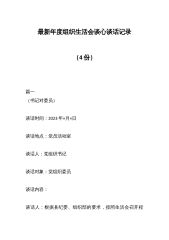 2023年基层党组织组织生活会谈心谈话记录(2篇)组织生活会谈心谈话记录(一)谈话时间:2023年*月*日谈话地点:单位党员活动室谈话人员:***谈话内容:***谈话人:根据县纪委、组织部的要求,按照生活会召开程序,今天我作为班长,与你谈谈心。你被县政府抽调到产业园工作,产业园近年来的工作有很大突破,连续两年税收突破*亿元大关,说明你的工作能力是非常强的。但是,不足之处,就是对我们机关的工作关心的少了,也没有主动给出意见和建议了。另外,我也是有一定的责任的,没能主动及时地征求你的意见和建议。我想我们双方都要作检讨,要齐心协力推进机关的工作。被谈话人:您提出的问题确实存在,这是我思想上的问题,总...